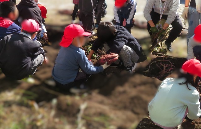 1年生と6年生は、一緒にお芋ほり。1年生によりそう6年生。とれたおイモを6年生に...
