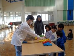 2月12日 信州大学繊維学部の学生2名が東部小学校に来校され、1年生にハナサク軍手ィをプレゼントしてくださいました。6色のカラフルな軍手の中から、自分で好きなものを選びました。プレゼントされたちび軍手ィを早速みんなではめてみました。「あったかい。」「気持ちいい。」「かわいい。」とみんな大喜びでした。軍手ィをプレゼントしてくださった信州大学繊維学部 ハナサカ軍手ィプロジェクトの皆さん、ありがとうございました。